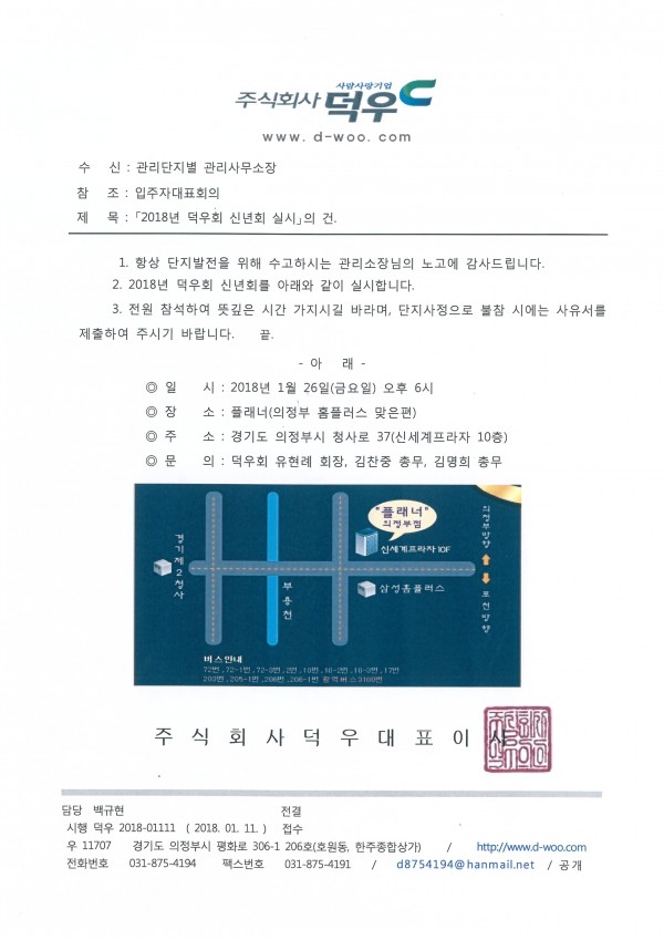 ■ 2018년 덕우회 신년회를 개최합니다. 페이지 정보 작성자 최고관리자 (115.♡.139.242) 작성일18-01-11 13:06 조회7,086회 댓글0건 관련링크 이전글 다음글 목록 본문 전원 참석하시어 뜻깊은 시간을 가졌으면 좋겠습니다.단지사정으로 불참시에는 사유서를 제출하여 주시기 바랍니다. 댓글목록 등록된 댓글이 없습니다. 이전글 다음글 목록
